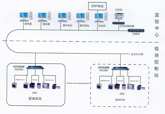 根據(jù)車(chē)間設(shè)備較多,分布比較分散的特點(diǎn),配電車(chē)間電量采集選用NZ194E完成一回線全電量采集,如電流、電壓等。其他監(jiān)控模塊選用NZ194I/O,采集直流模擬量如車(chē)速、溫度、流量等數(shù)據(jù),實(shí)現(xiàn)對(duì)車(chē)間生產(chǎn)設(shè)備的全面監(jiān)測(cè)。同時(shí)通過(guò)RS485總線把數(shù)據(jù)集中到串口服務(wù)器NZ100X上,集中后經(jīng)以太網(wǎng)把數(shù)據(jù)送往監(jiān)控中心,由NZ800P配電電動(dòng)化系統(tǒng)軟件處理。