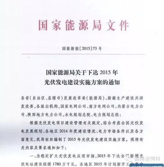 消息:2015年3月16日,國(guó)家能源局關(guān)于下達(dá)2015年光伏發(fā)電建設(shè)實(shí)施方案的通知,既國(guó)能新能【2015】73號(hào)文件。通知稱2015年我國(guó)光伏建設(shè)指標(biāo)為17.8GW。創(chuàng)歷史新高。